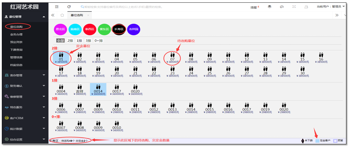 一、墓位管理:园区墓地的销售、预定的管理。其中包括墓位选购(其中包括预定)、预定列表、购墓列表、管理费到期。