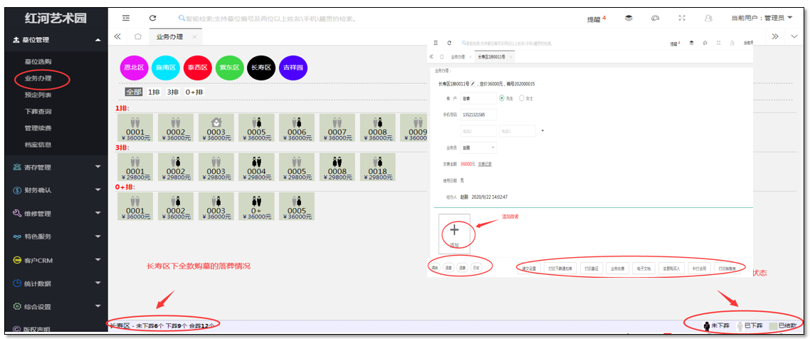 二、落葬管理:可视化的展现方式,直观展示了已落葬、未落葬的墓位位置、数量。以便施工部门合理调配工作人员,制定详细工作排期。对已经正式购买墓地的落葬办理以及公墓证打印等,其中包括预约落葬、预约列表、直接落葬。