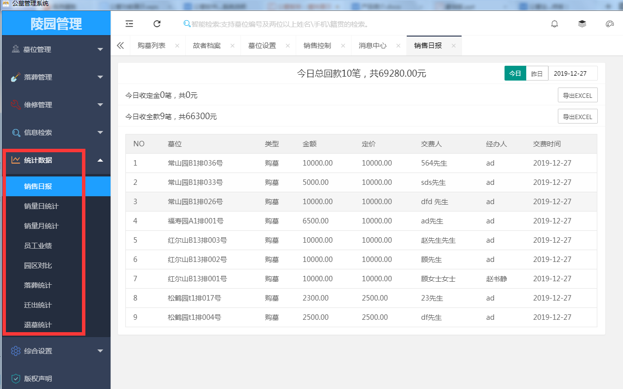 五、统计数据:各类数据的统计分析以及相关报表,可以给出一个量化的结果数字辅助决策。其中包括销售日报、销量日统计、销量月统计、员工业绩、园区对比、落葬统计、迁出统计。