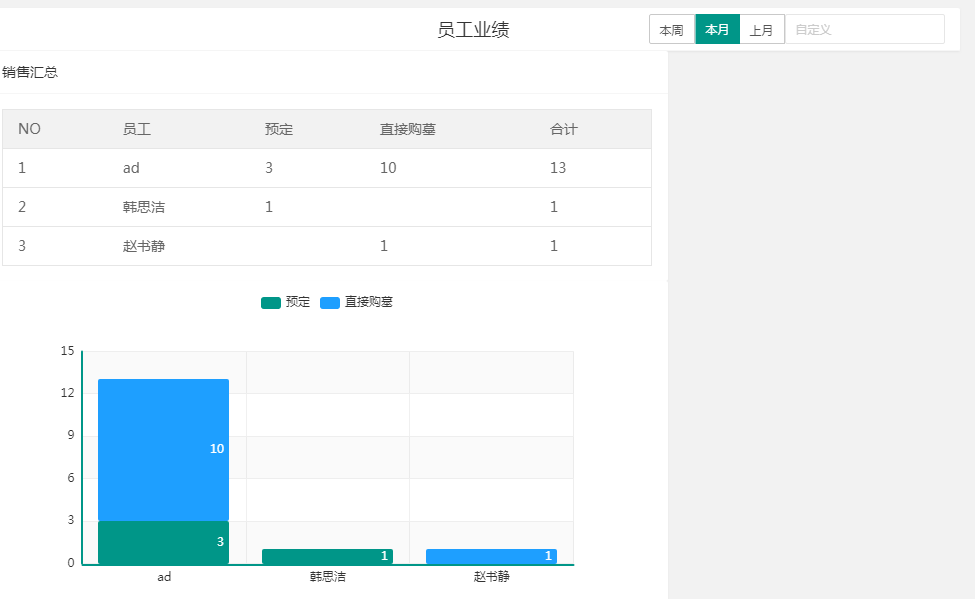 4、员工业绩: 领导可查看员工本周、本月、上月或某个时间段的收定金墓位套数、直接购墓套数,及合计;收定金墓位的金额汇总,直接购墓金额汇总、结款金额、补交金额及合计。