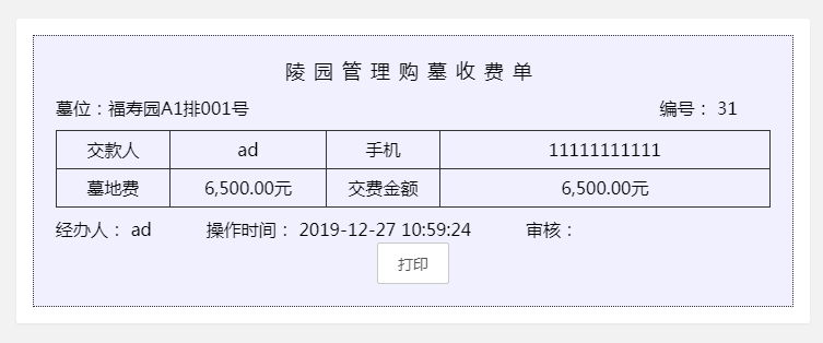 3、落葬登记:已完成落葬的信息登记,打印墓证、缴费证明等,可查看墓位操作日志、退费、退墓、迁出、碑文确认、可以增加落葬等操作。